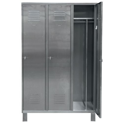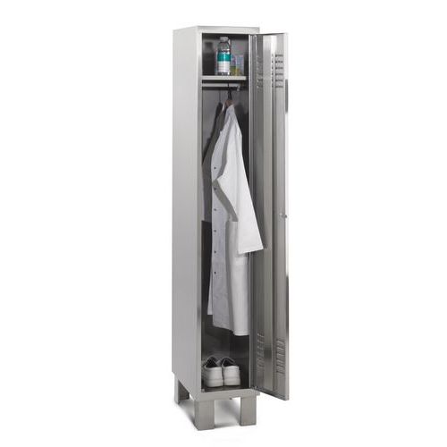 Täyshitsattu vaatekaappi ruostumattomasta teräksestä, AISI 304. Erinomainen valinta laboratorioihin, keittiöihin tai muihin tiloihin, joissa hygienialta ja toimivuudelta vaaditaan paljon. Kestää kylmää, kuumaa, kosteutta, kemikaaleja ja iskuja. Ovessa ilmastointireiät. Sisältää yhden hyllyn. Säppi riippulukolle. Kaksi mallia: väliseinällinen tai yhtenäinen säilytysosa. Väliseinä jakaa kaapin kahteen osaan, joissa puhtaat ja likaiset vaatteet voidaan säilyttää erillään