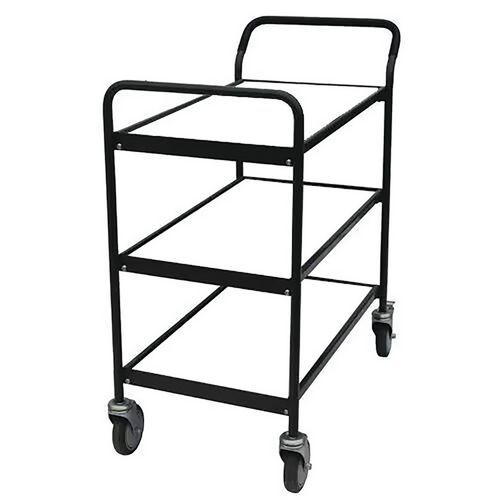 Tarjoiluvaunu, jossa puiset hyllytasot ja runko teräsputkea.