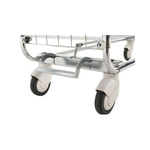 Ainutlaatuinen vaunu, jonka pyörät voidaan lukita yksinkertaisesti vaunun lyhyelle sivulle sijoitetulla polkimella.