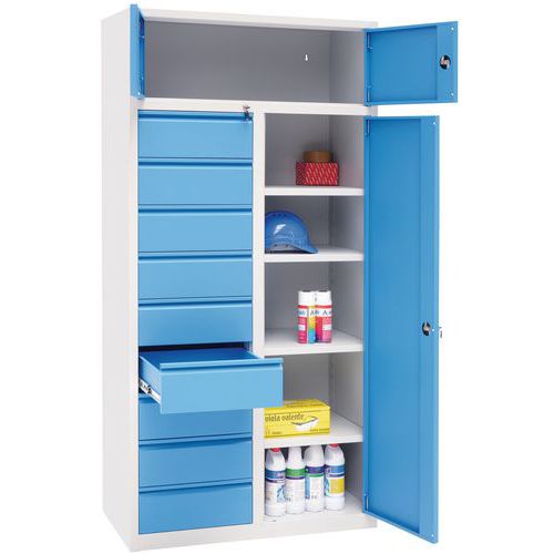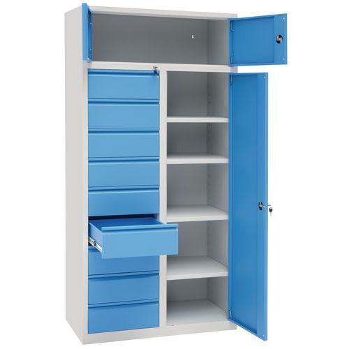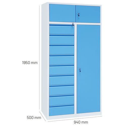 | Tavaranimike | Yhdistelmäkaappi, Maks kuormitus: 500 kg, Materiaali: Teräs, Kokonaiskorkeus: 1950 mm, Lkm, laatikot: 9 |