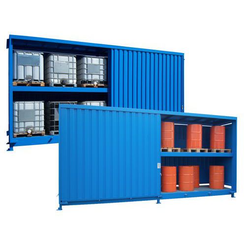 Ympäristökontti WSC-F-E.2 koostuu tukevasta runkorakenteesta, joka on valmistettu ontelo- ja valssatuista profiileista. Tarkoitettu palavien nesteiden passiiviseen varastointiin GHS-luokissa 1–3 sekä vesistöä vaarantavien nesteiden varastointiin GHS-luokissa 1–4. WSC-F-E.2-sarjassa on ympäristökontteja sekä 200 litran tynnyrien että IBC-säiliöiden varastointiin. Irrotettavat, kuumasinkityt ritilälattiat, joiden kantavuus on 1500 kg/m² (51025 / C22-5062-C) / 1000 kg/m² (51024 / C22-5061-C & 51026 / C22-5063-C) jokaisella varastointitasolla, takaavat vakauden ja helpottavat puhdistusta, ja galvanoidut nesteenohjauslevyt lisäävät turvallisuutta mahdollisessa onnettomuustilanteessa. Varastointikapasiteetti: 51024 / C22-5061-C: 200 litran tynnyrit – 40 suoraan ritilälattialla, 32 kemikaalilavoilla tai 24 eurolavoilla. 51025 / C22-5062-C: IBC – 12 kpl. 51026 / C22-5063-C: 200 litran tynnyrit – 48 kemikaalilavoilla tai 32 eurolavoilla. Kontin ulkovaippa on maalattu värillä RAL 5015, ja lukittavat liukuovet trapetsimuotoisesta pellistä tarjoavat erittäin hyvän korroosiosuojan. Toimitus sisältää nostosilmukat nosturikuljetusta varten kontin ollessa tyhjä, 100 mm maavaran ilmanvaihtoa varten, kuumasinkityt pohjalevyt mukaan lukien maadoitusliitäntäpisteet sekä komposiittiankkurit kontin kiinnittämiseen.