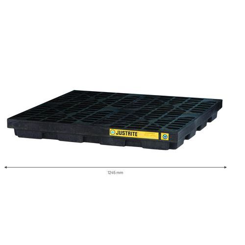 Ympäristölattia 100 % kierrätyspolyetyleenistä. Useita eri kokoja, 1–6 kappaletta 208 litran tynnyreitä – yhdistä ja rakenna säilytys tarpeesi mukaan. Kokoaa roiskeet tynnyreistä ja kanistereista ja estää epäpuhtauksien leviämisen. Erinomainen apuväline aineiden tyhjennys- ja siirtotehtäviin. Matalan rakenteen ansiosta tynnyreiden siirtäminen lattialle ja lattialta sujuu yksinkertaisesti. Kestää useimpia kemikaaleja, kuten öljyjä, lakkabensiiniä, happoja ja emäksiä. Ritilät on helppo irrottaa pestäväksi